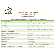 The Coffee Crafters team in the USA designs and manufactures the Valenta 3 Deluxe, an economical yet productive commercial coffee roaster. This all-electric, energy-efficient fluid bed system handles batches from 200g to 3 lbs, achieving hourly outputs of 21 lbs. It stands out as one of the market's most cost-effective and high-performing commercial roasting solutions.