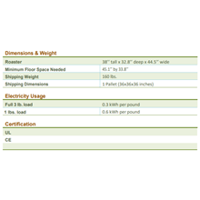 - Energy efficient (only 0.4 kWh per pound electricity usage)